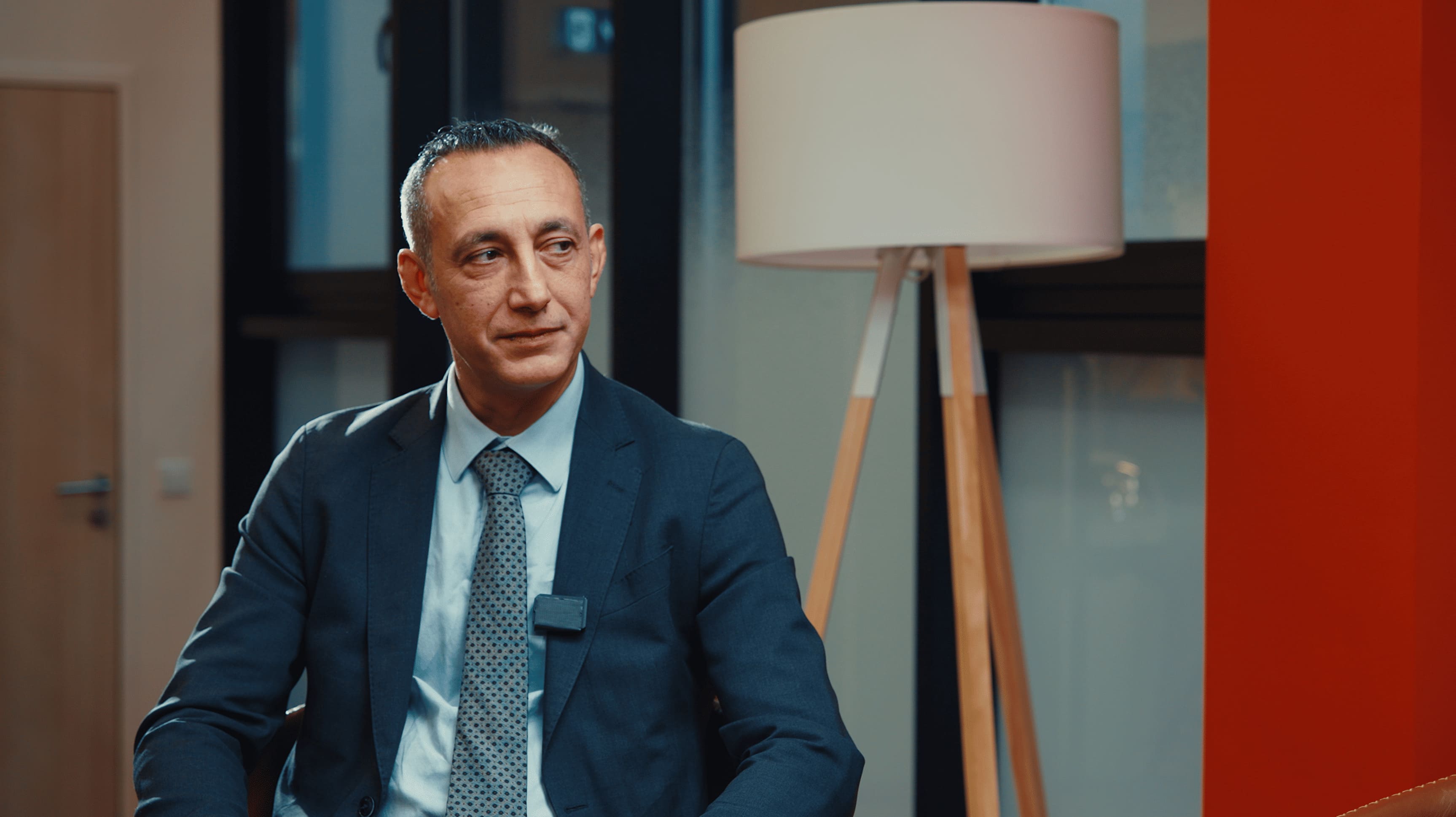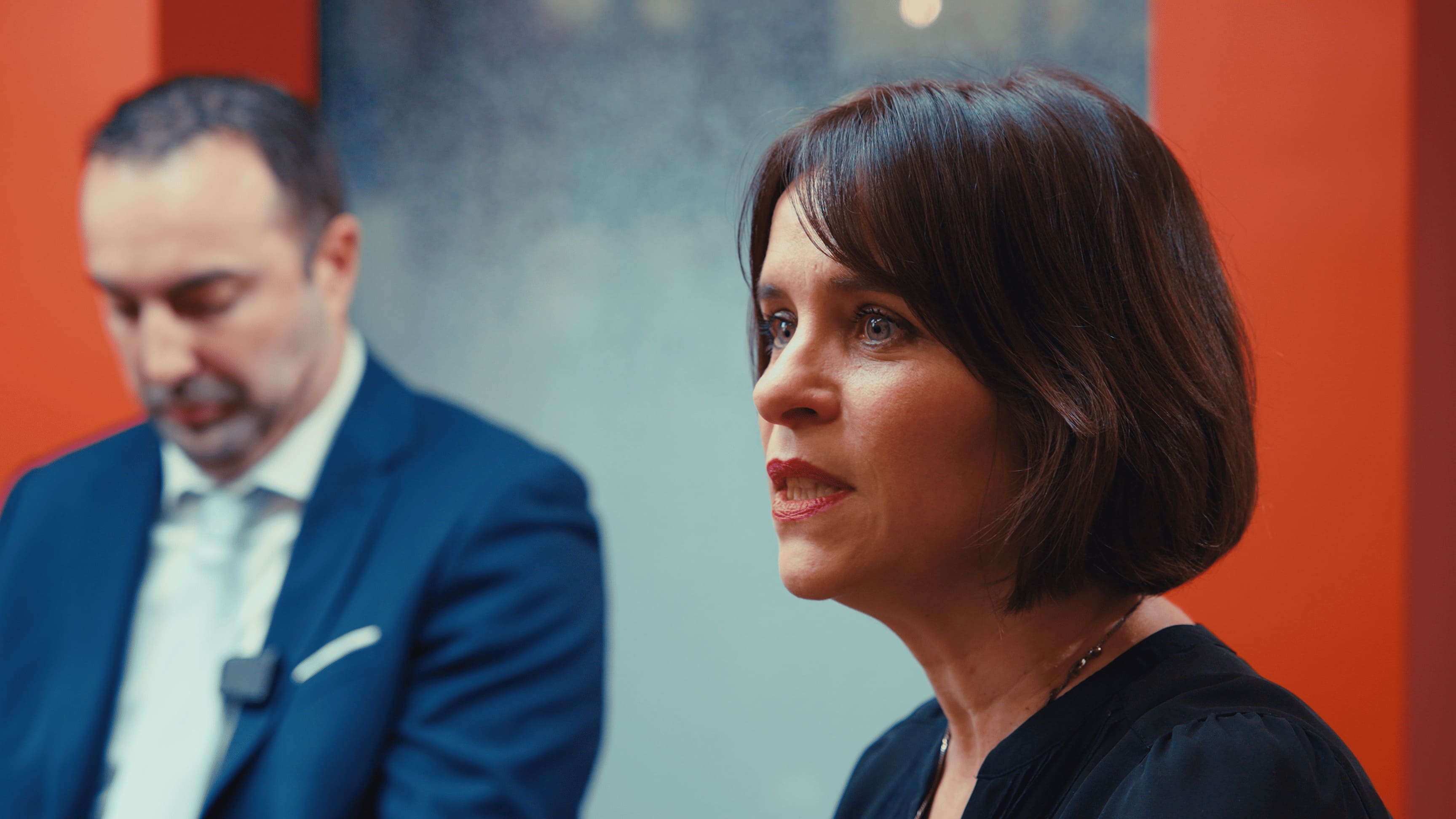 Deux caméras étaient installées sur travelling pour apporter un mouvement léger et constant. Un prompteur a été intégré à l’une des caméras. Un système spécifique a été développé pour adapter le prompteur à une caméra mobile, afin de conserver un regard naturel vers l’optique et éviter toute rupture dans l’axe de regard.